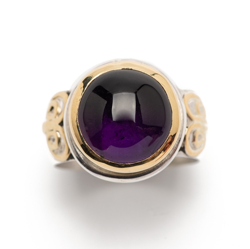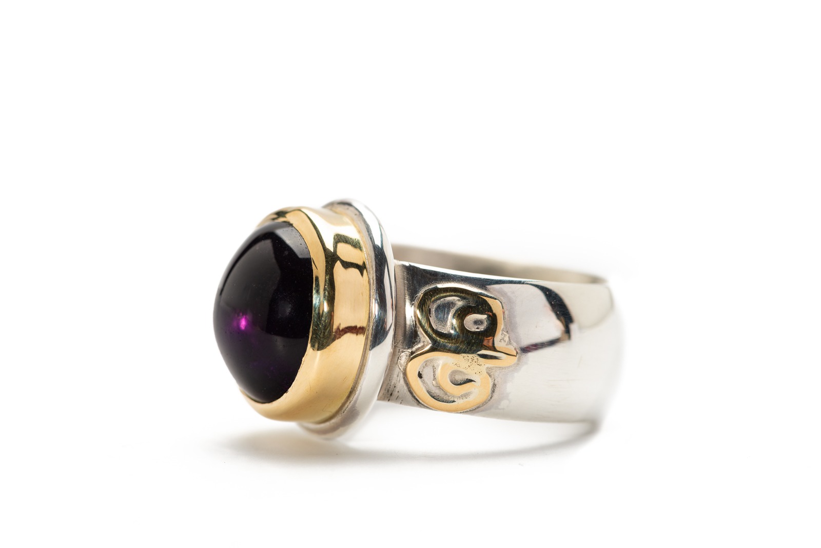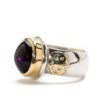 This nice ring with a big round deep purple amethyst set in gold has an extra silver wire around the setting and extra gold on the siver ring. The ring itself is silver and 10 mm (0.39 inch) wide, but the ring is smooth and rounded on the outside as well as on the inside of the ring. This makes it really nice and comfortable to wear, because the ring feels smooth despite the width.