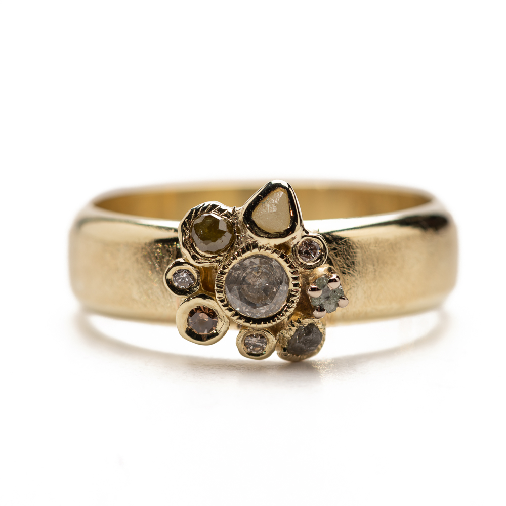 stunning natural diamonds rozet ring, an ice Brillant in the middle is surrounded bij all natural diamonds: rough, industrial keisers and commercial brillant toghether in a beautifull cluster
