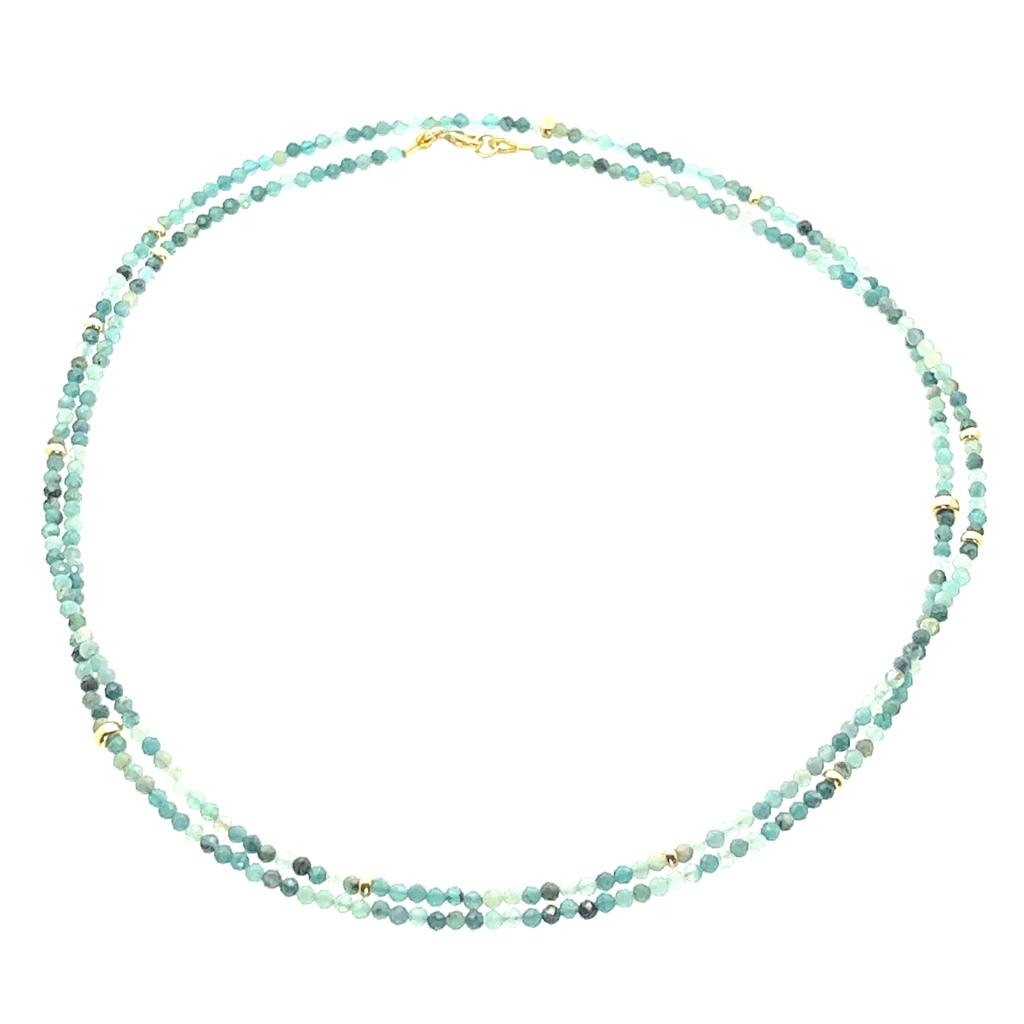 The Blue Tourmaline Necklace with Gold Beads contains the following materials.
