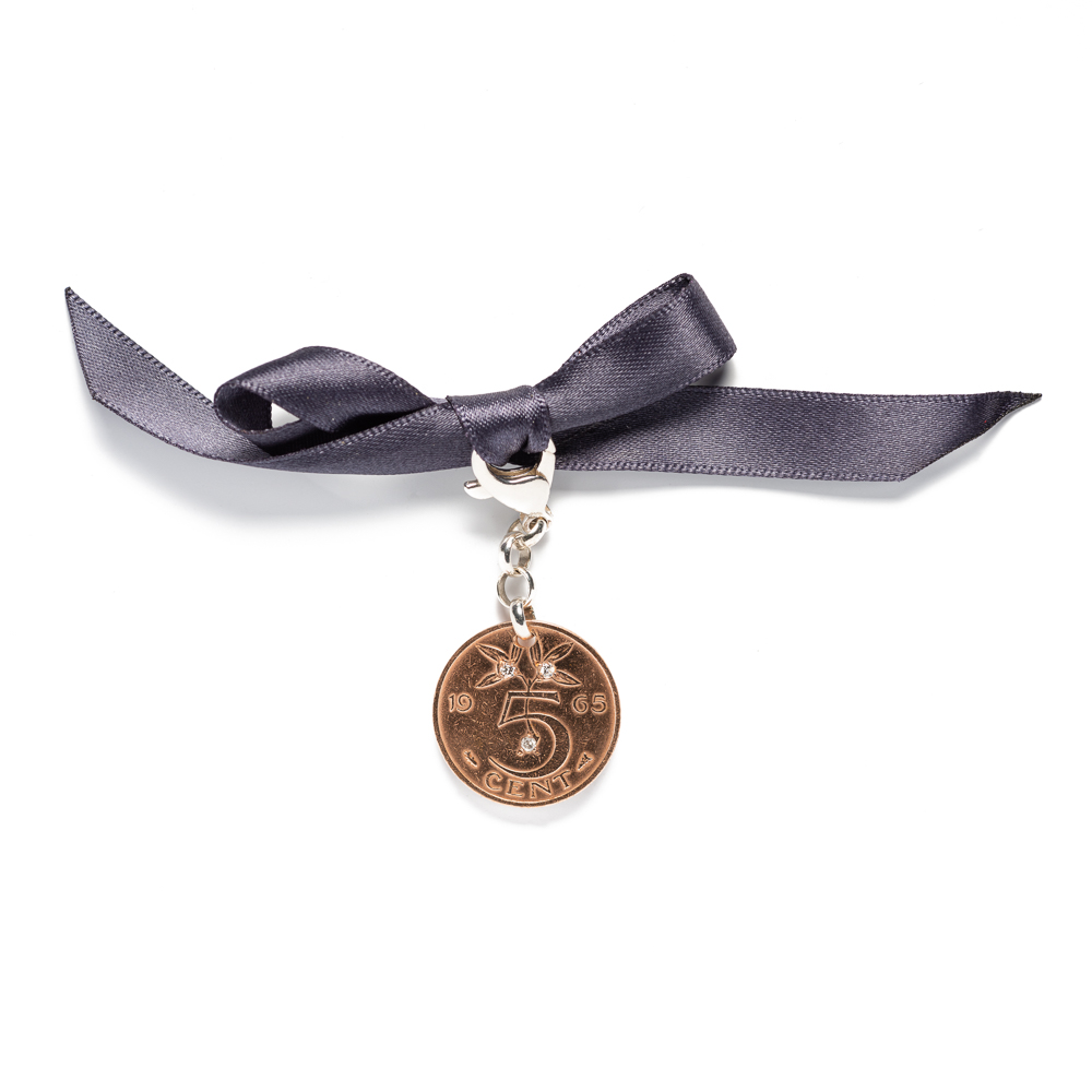 Diamond Medal prosperity coin; suiteable for male and female. 5 Guildercent piece set with broken dreams brilliant, to use as keychain or zipperlip pendant, available with or without the ribbon, and in different years