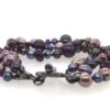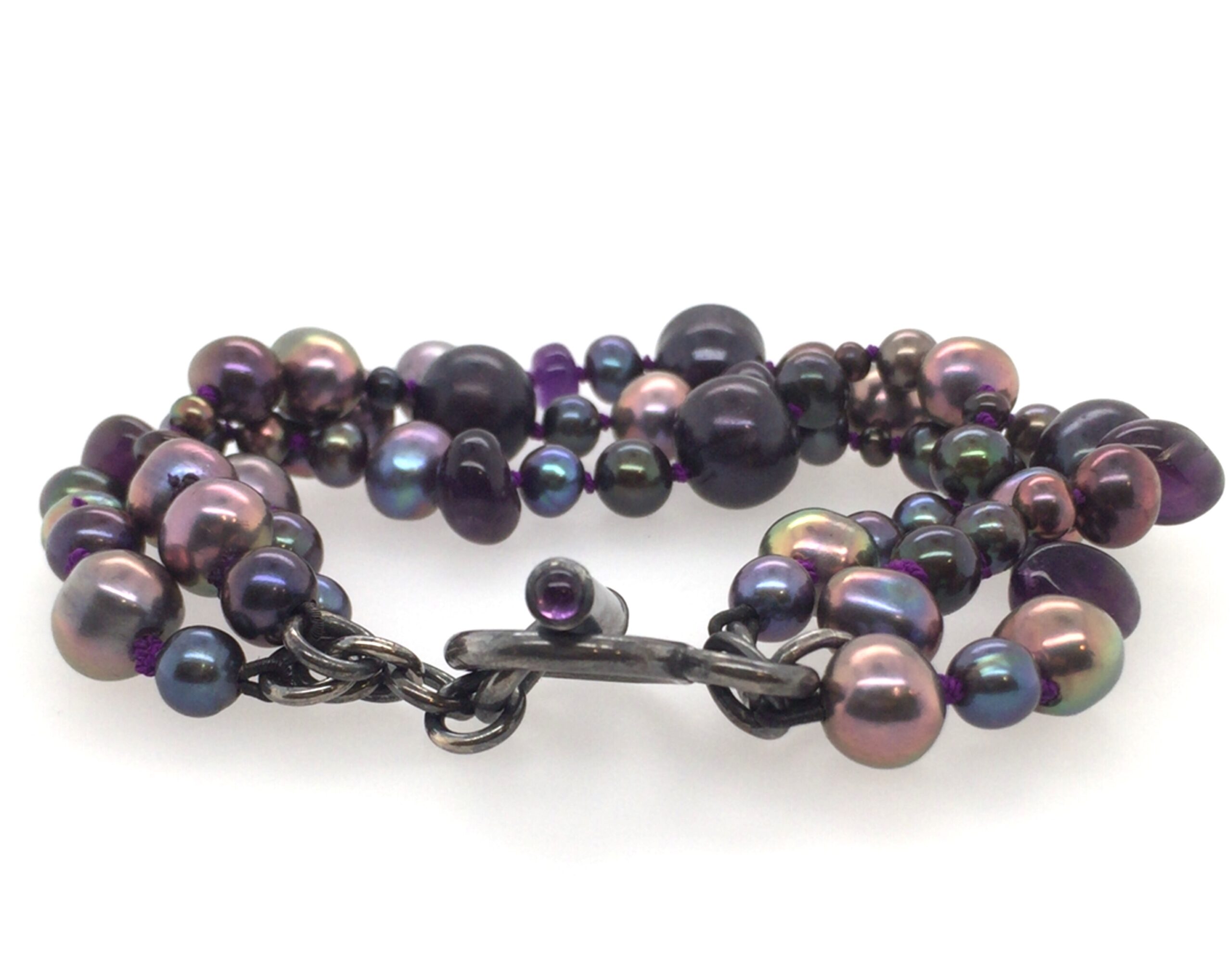 material: handmade oxidized silver toggle clasp with two cabochon cut amethysts and three strings knotted dark pearls in various sizes on purple wire
