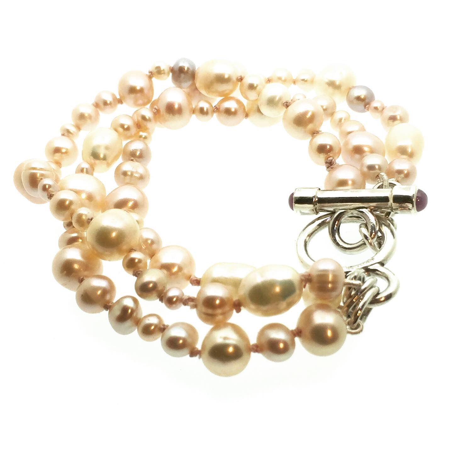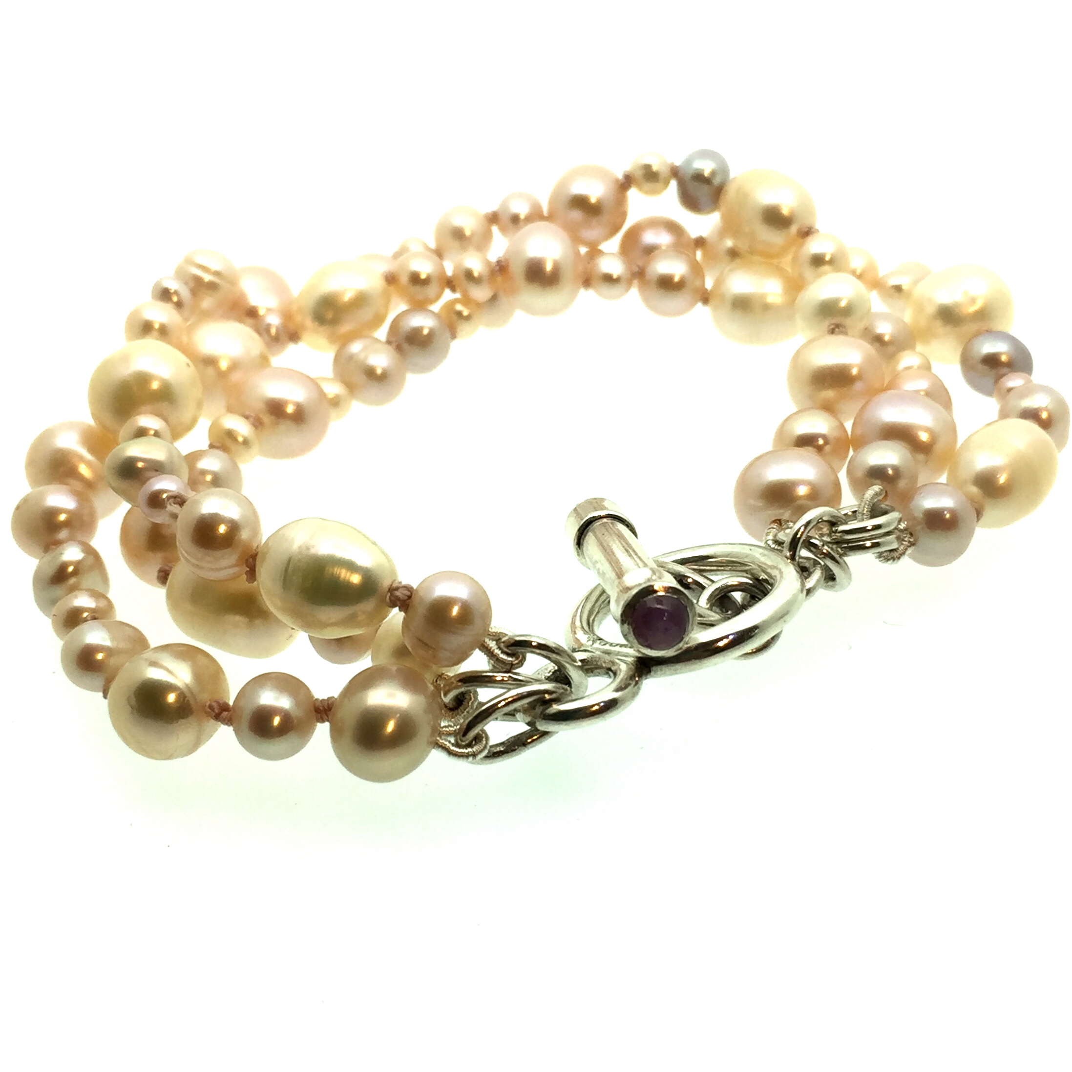 material: handmade silver toggle clasp with three strings knotted pink pearls and two rubies