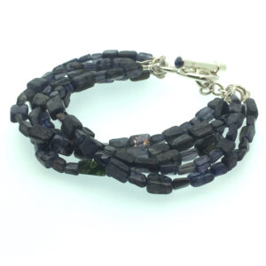material: handmade silver toggle clasp with two cabochon cut rubies and three strings knotted white pearls in various sizes on bright pink wire