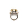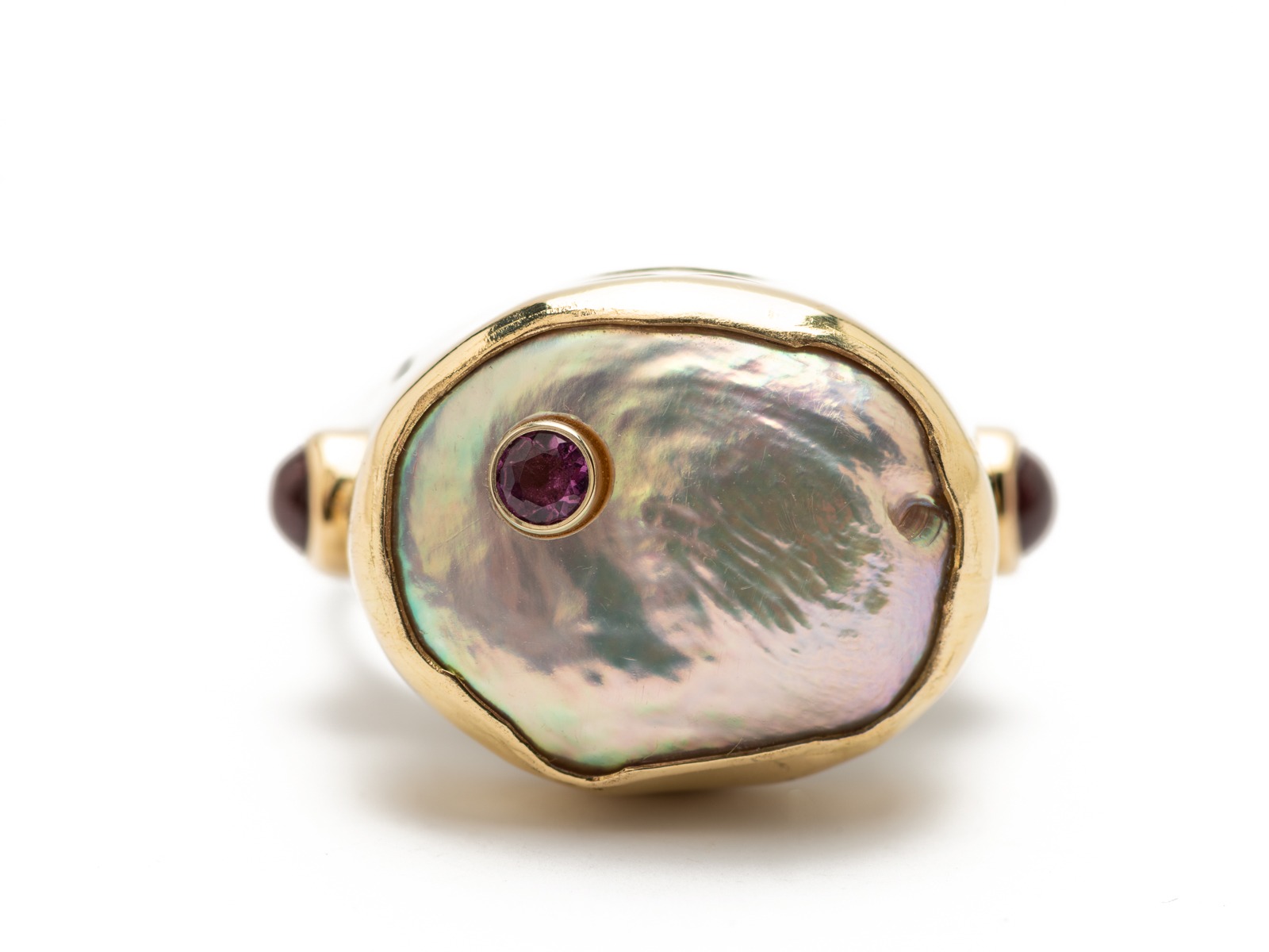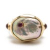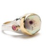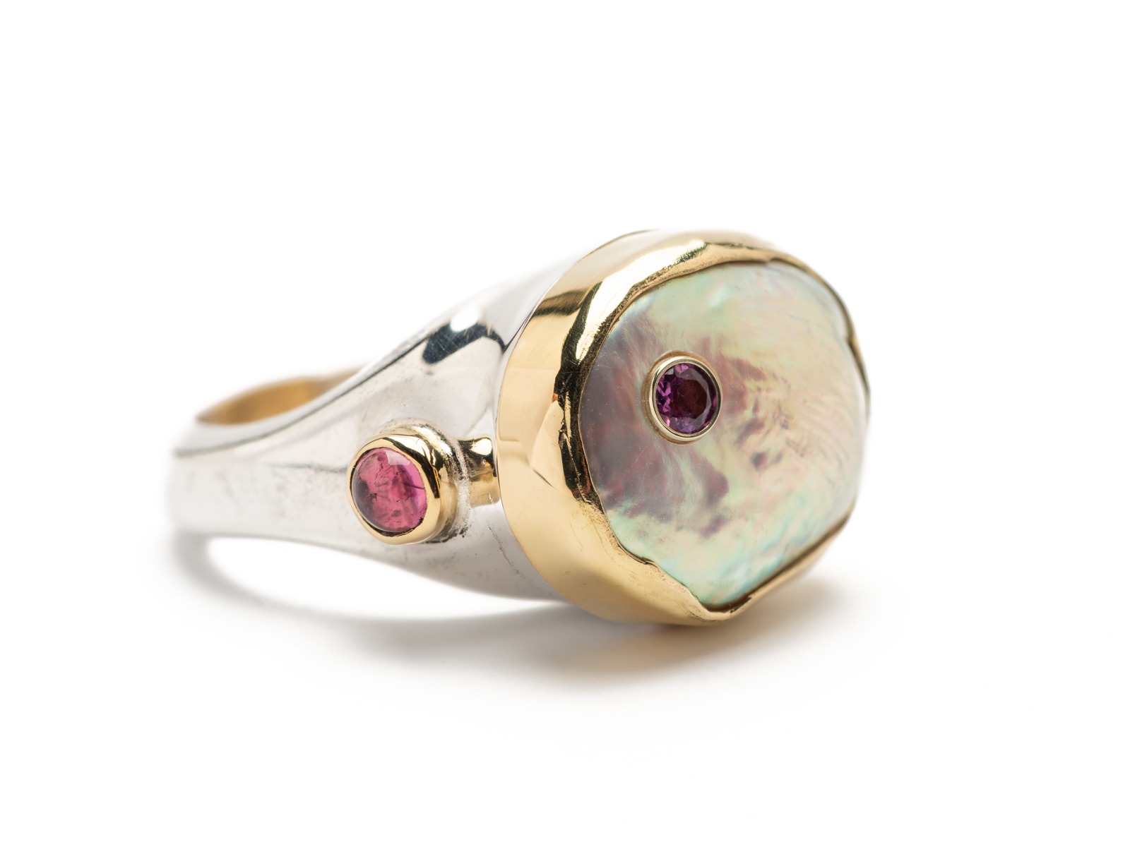 material: silver ring, white pearl, two cabochon pink tourmalines and one brilliant cut tourmaline, 14K gold.