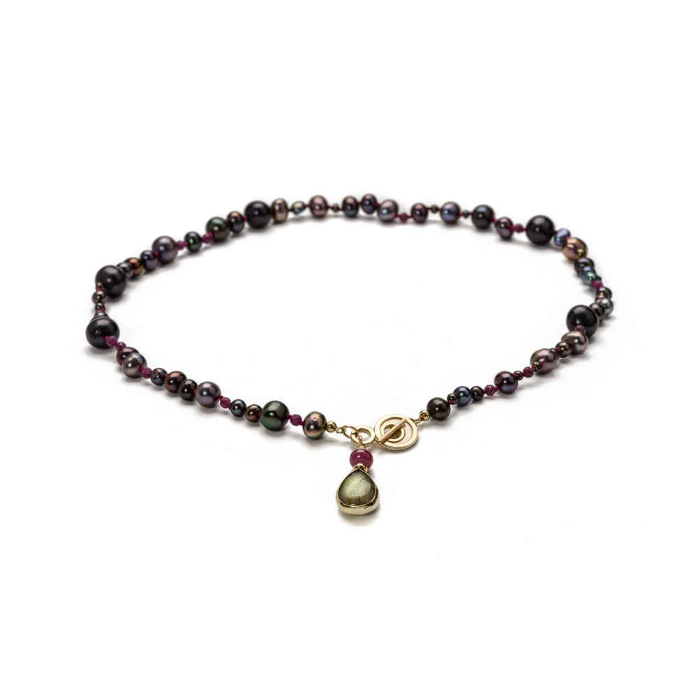 The Pearl and Ruby Necklace with Labradorite Pendant by goldsmith Froukje van der Avoird