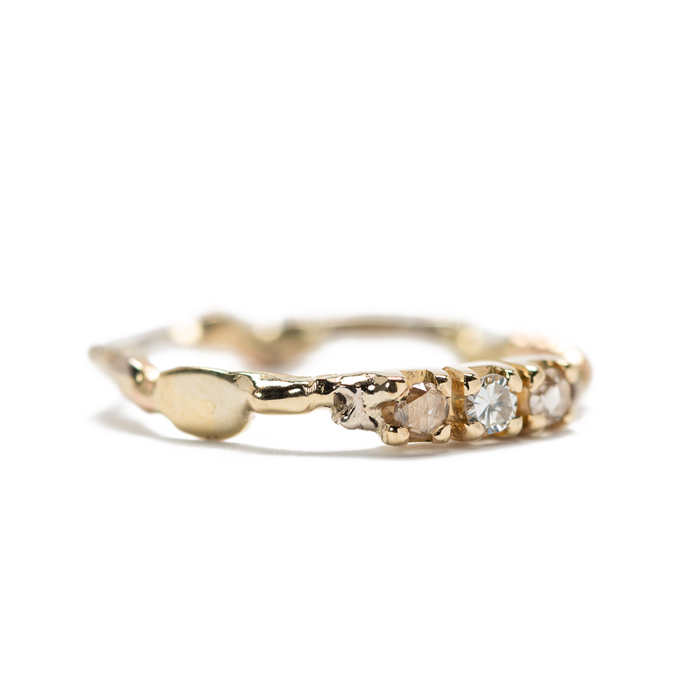 2 rose and 1 brillant cut diamonds in this “leftovers-ring” ,so called because its made out of small pieces different colours and shapes gold from the workingbench, one of a kind for sure and the size can be adjusted