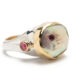 material: silver ring, with 18K gold setting for the small blue topazes on the sides and also 18K gold setting with extra silver and gold and then the 9 mm blue topaz in the middle which is set in silver again